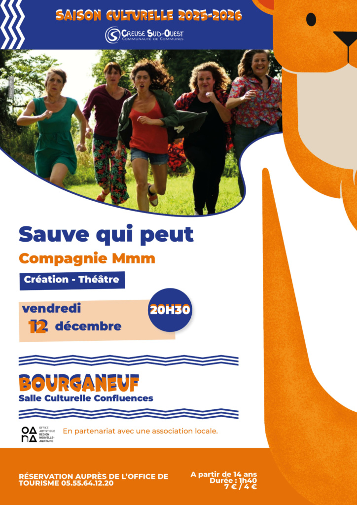 Réservation auprès de l’Office de Tourisme au 05.55.64.12.20. Pour plus d’informations concernant le spectacle, consultez la plaquette de la saison culturelle en cliquant ICI.